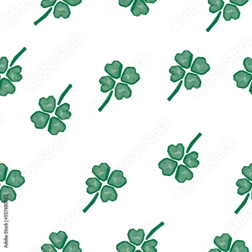Seamless pattern designed with green lucky four-leaf clover drawn with gouache, recommended for wrapping paper, textile pattern and wallpaper