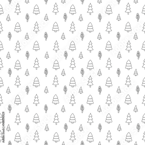 Seamless pattern doodle trees. Black and white line art. Hand drawn vector illustration. line art. Nature and forest concept