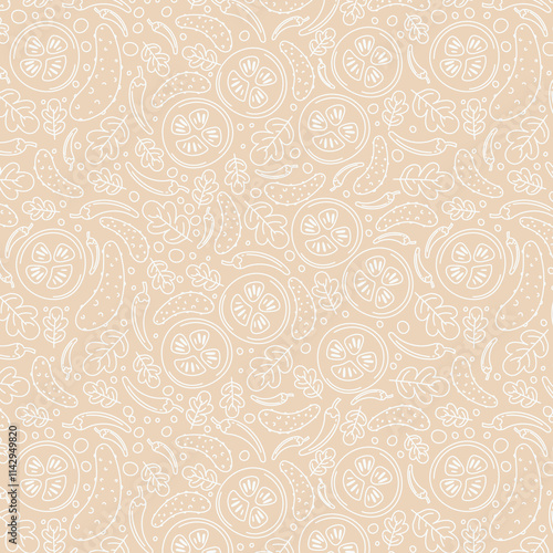 Seamless pattern doodle vegetables on dark background. Red and green pepper, hot chili, tomatoes, jalapeno, paprika, seeds, herbs. Vegetables cut half, piece. Farm products. Hand drawn illustration