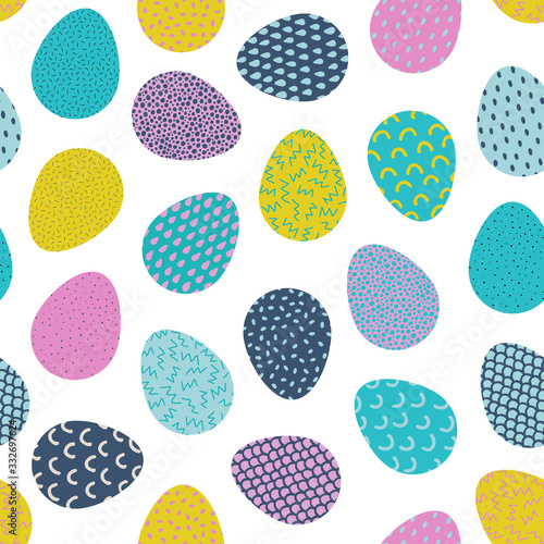 Seamless pattern. Easter eggs with different hand drawn ornaments isolated on the white background. Texture for print, wallpaper, home decor, textile, package design or invitation.