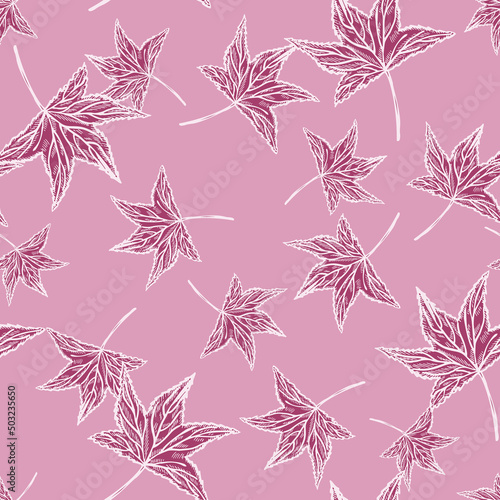 Seamless pattern engraved tree leaves. Vintage background botanical with foliage in hand drawn style.