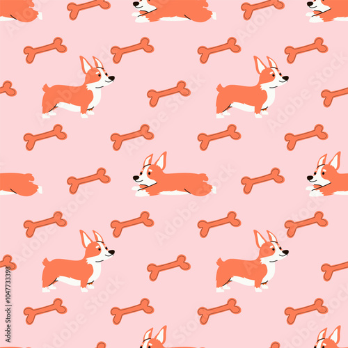 Seamless pattern featuring a cute corgi surrounded by bone-shaped cookies, perfect for adding a playful touch to autumn-themed designs.