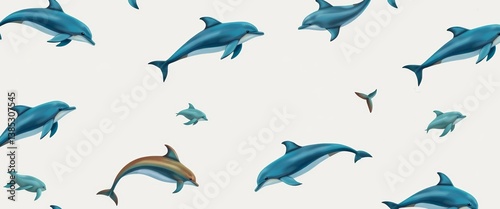Seamless pattern featuring playful dolphins swimming in various directions against a clean white background, surface pattern, repeat