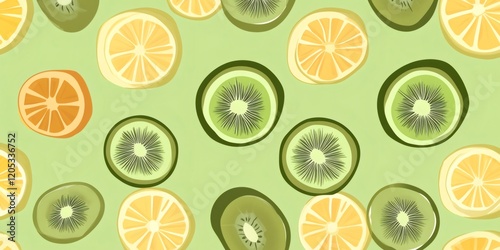 Seamless pattern featuring repeating kiwi and citrus fruit slices on a gradient green background, ideal for food themed projects