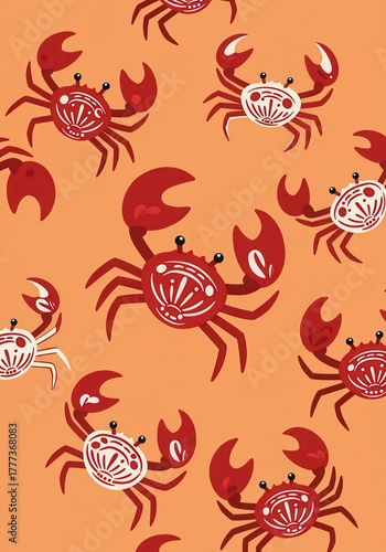 Seamless pattern featuring stylized red crabs on an orange background. A playful and vibrant design perfect for summer themes, beach motifs, or children's products.
