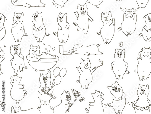 Seamless pattern funny pigs. Vector illustration. Isolated black contour on a white background.