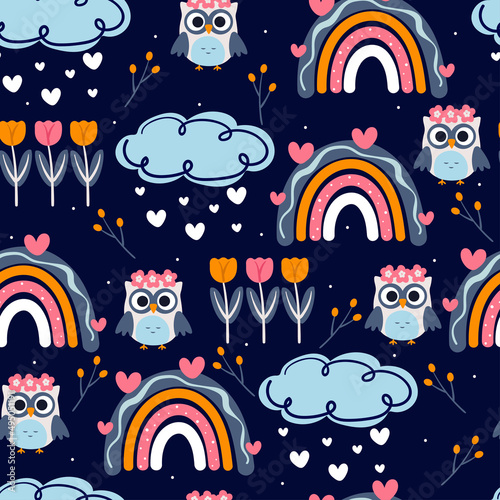 seamless pattern hand drawing cartoon owl, boho rainbow, clouds and flower. spring background for fabric print, textile