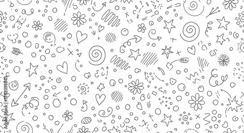 Seamless pattern handdrawn doodle elements including stars, hearts, flowers, arrows, and scribbles on, perfect for creative design