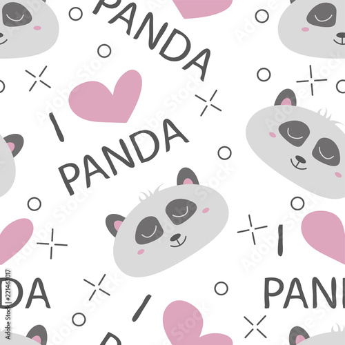 Seamless pattern hand-Drawn faces of pandas. Background for Children clothing. I Love Panda pattern