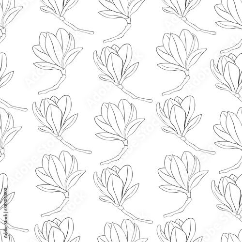 Seamless pattern Magnolia flowers black and white colors graphics vector illustration