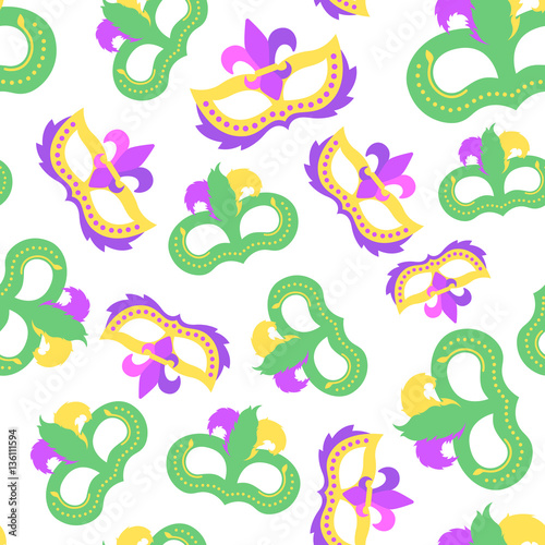 Seamless pattern mardi gras mask with color feather. Background colorful props for carnival or theater.