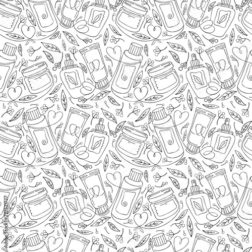 Seamless pattern natural herbal organic cosmetic. Hand drawn background: cream, tube, spray, herbs, leaves, berries. Black and white continuous line, art line. Concept of plant eco cosmetics