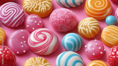 Seamless pattern of 3d colorful pink lollipops, caramels, sweets, dessert, food, trick or treat, candy, sugar, background, wallpaper, place for text, design