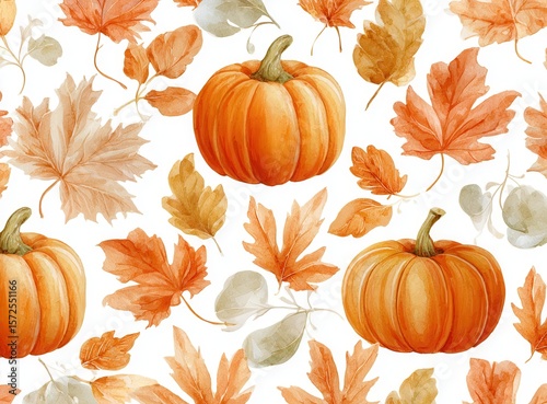 seamless pattern of autumn leaves, acorns, pumpkins, mushrooms, warm orange and yellow tones