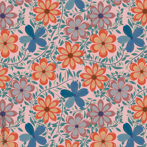Seamless pattern of beautiful bice blue, jasper, redwood color flowers with cambridge blue , myrtle green color leaves and veins on tea rose background. textile design, wallpaper, fabric , bedding.