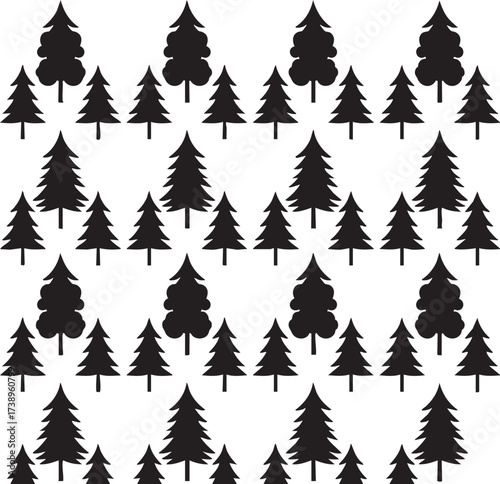 Seamless pattern of black pine tree silhouettes in rows isolated on white background