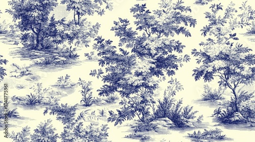 Seamless pattern of blue trees and foliage on a white background.