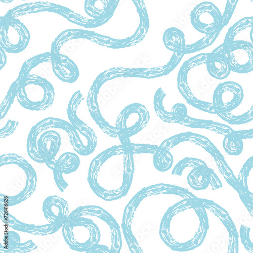Seamless pattern of bright colorful abstract squiggles print, continuous line, textured scribble spiral and wavy lines. retro 80s. Chaotic ink crayon dry brush texture. Vector illustration.