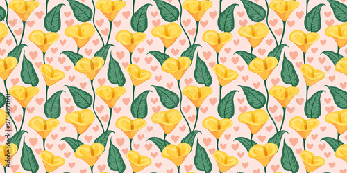 seamless pattern of bright yellow calalilies with mint green leaves on a blush pink heart-patterned background