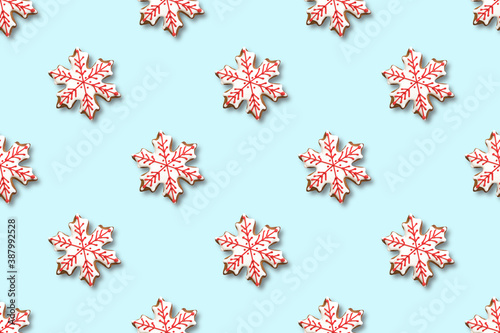 Seamless pattern of Christmas gingerbread in shape snowflake on blue. Xmas abstract background.