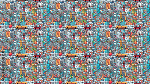 Seamless pattern of cities for children, created with generative AI technology