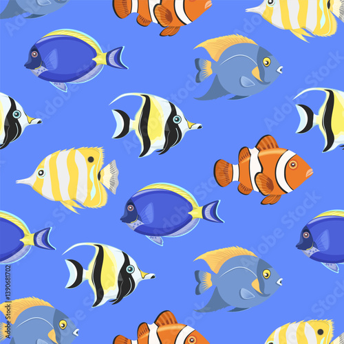 Seamless pattern of clown fish,surgeon fish,butterfly fish,angel fish,Moorish idol on a blue background.Vector pattern for textiles,for summer designs, backgrounds.