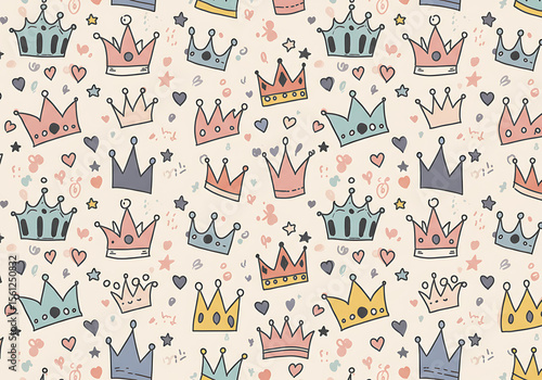 Seamless Pattern of Colorful HandDrawn Crowns Hearts and Stars on a Light Background.