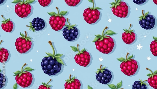 Seamless pattern of cute cartoon blackberries on a soft indigo background, minimalistic style, bold outlines, light shadows, playful and fresh design, kawaii aesthetic.