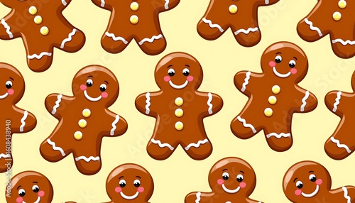 Seamless pattern of cute cartoon gingerbread men smiling on a yellow background, ideal for christmas themed projects
