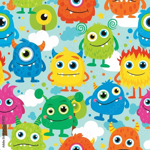 Seamless Pattern of Cute Colorful Monsters on a Light Blue Background