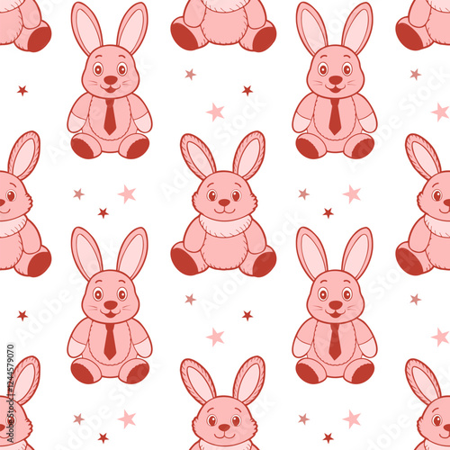 Seamless pattern of cute plush bunnies and stars. Pink plush toys print. Children's background.