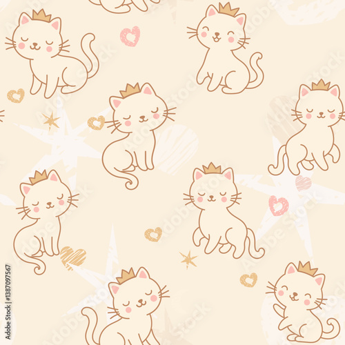 Seamless Pattern of Cute Princess Cat Wearing Crown with pastel-colored hearts, stars, on beige Background