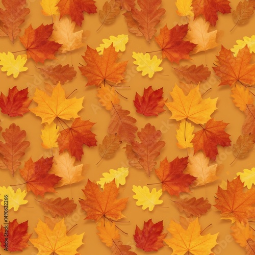 Seamless Pattern of Falling Autumn Maple and Oak Leaves in Warm Orange, Red, and Yellow tones. Tileable Design For Wallpapers, Packaging, and Fall-Themed Projects