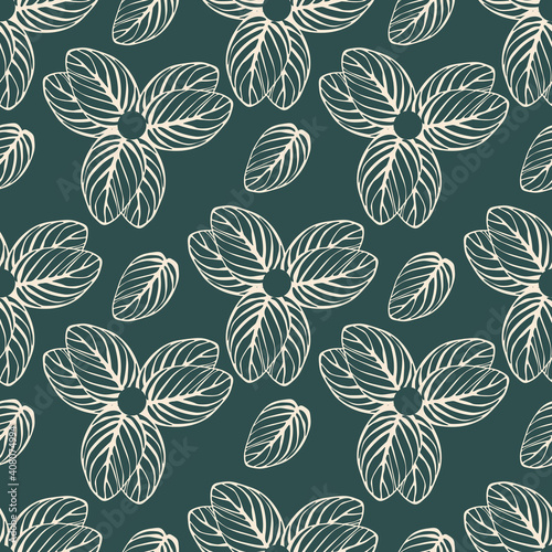 Seamless pattern of flowers from striped pink leaves on a green background. Template for printing on textiles, fabric, bedding, wrapping paper, wallpaper.