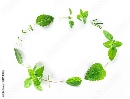 Seamless pattern of fresh herbs and spices basil, sage, rosemary, oregano, thyme, lemon balm, peppermint and mint setup with flat lay on white background