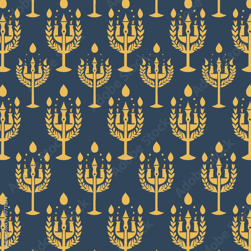 Seamless Pattern of Golden Candelabras with Laurel Wreaths on a Dark Blue Background