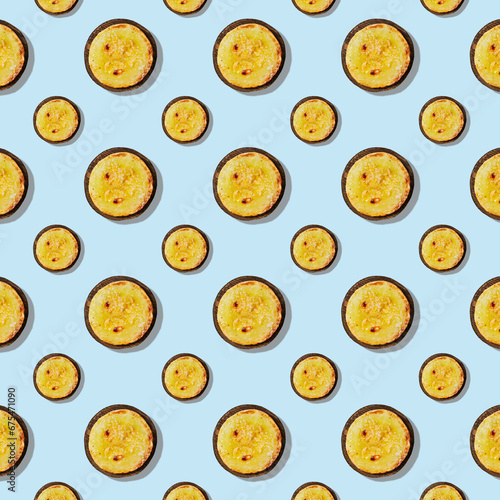 Seamless pattern of grilled zucchini on a wooden round board isolated on blue background.