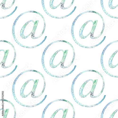Seamless pattern of Hand drawn watercolor Email address sign Arobas illustration. On white.