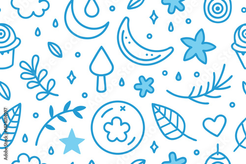 Seamless Pattern of HandDrawn Moon, Star, Flower, Leaf, Cloud in Blue