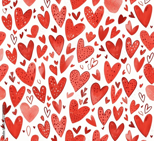 Seamless Pattern of Hand-Drawn Red Hearts with Bold Brush Strokes on White Background