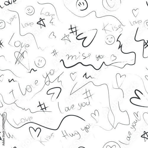 Seamless pattern of hearts, smiles, stars line declarations of love written by hand. Trendy modern pattern. Sweet love texture for postcards, banners, posters, websites and decorative prints.