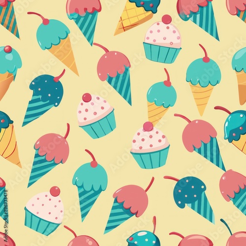Seamless pattern of ice cream cones and sundaes, Generative AI