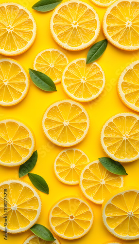 Seamless pattern of lemon slices on a yellow background, magazine photoshoot