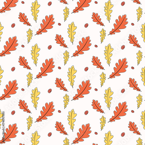 Seamless pattern of orange and yellow oak leaves and acorns isolated on white background