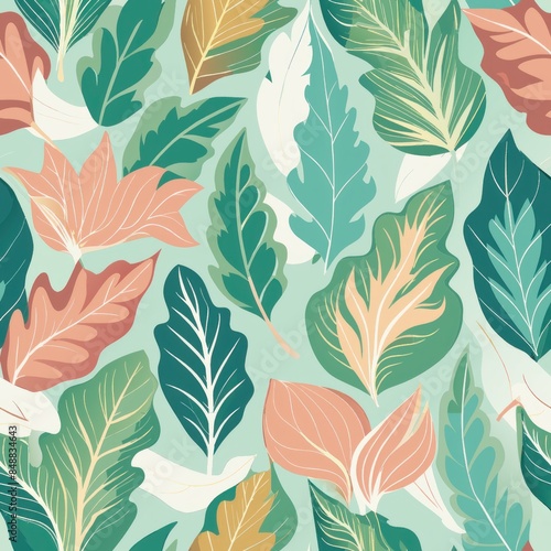 Seamless pattern of pastel-hued leafy greens with delicate textures, Generative AI