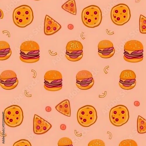 Seamless pattern of pizza slices, burgers, and small circles on a peach background for design