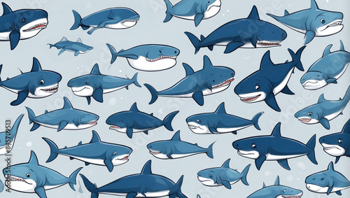 Seamless pattern of sharks in cartoon style. Concept of marine life.