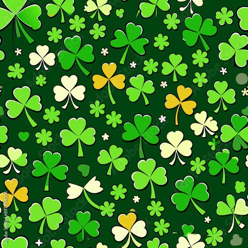 Seamless pattern of St. Patrick's Day shamrocks and leprechauns, Generative AI
