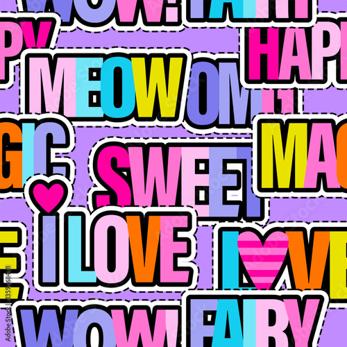 Seamless pattern of sticker with slogans. Bright colorful Abstract print background for fabric, wrapping, textile, wallpaper, apparel. Vector illustration for teen girl. Funky style
