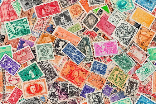 Seamless pattern of vintage postage stamps from around the world, slightly overlapping